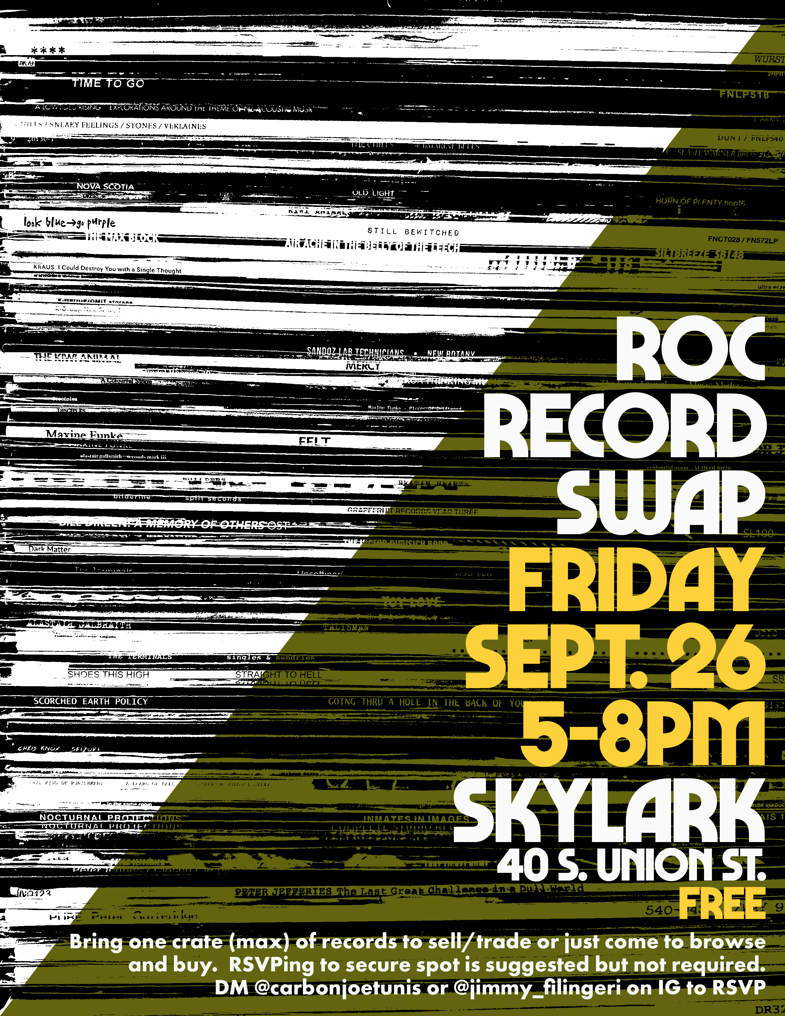 The first ROC RECORD SWAP in cooperation with Carbon Records & Rockin Rochester will be at Skylark Lounge on Friday Sept 26, 5-8pm. Bring one crate (max) of records to sell/trade or just come to browse and buy, and have some drinks while you’re at it.