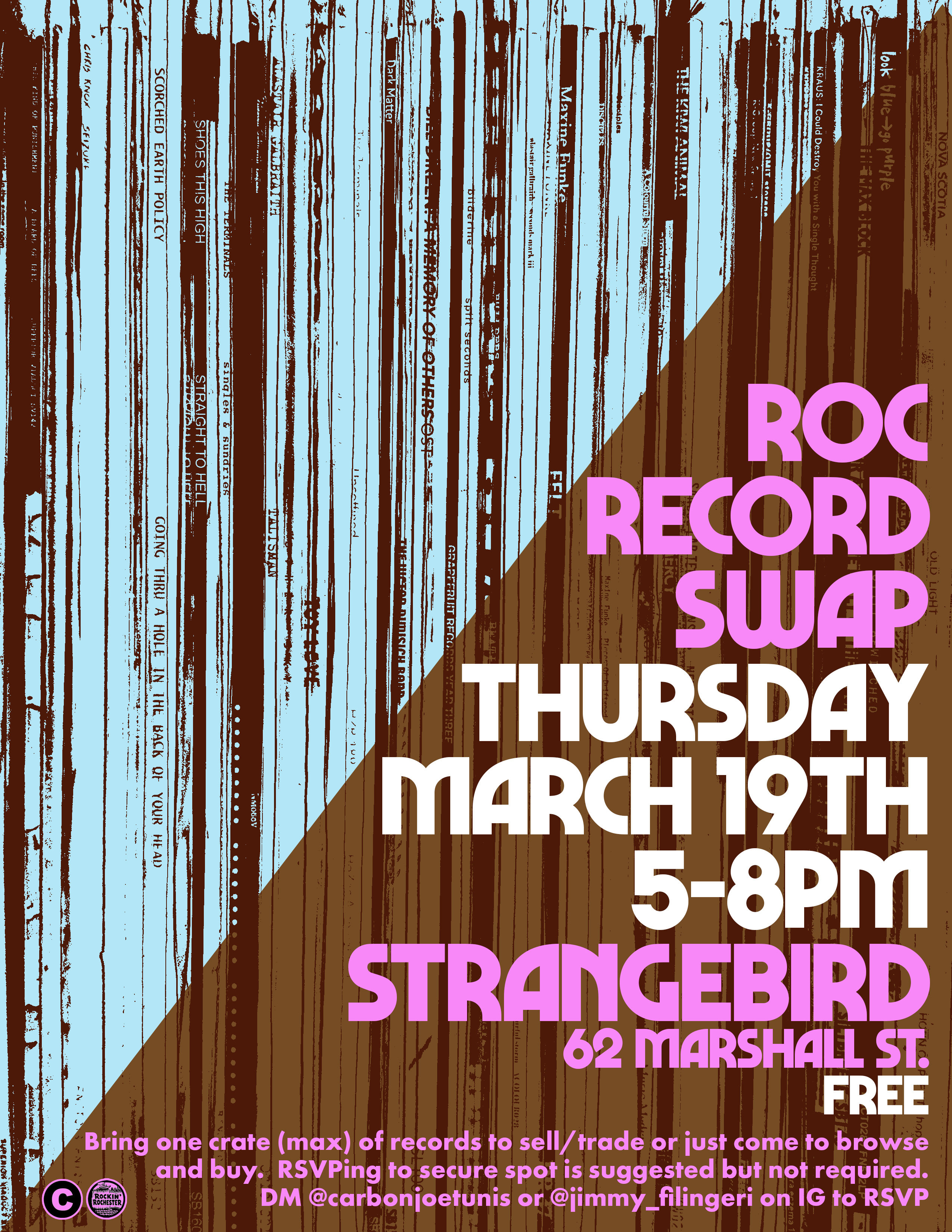 ROC RECORD SWAP in cooperation with Carbon Records & Rockin Rochester will be at STRANGEBIRD on Thursday March 19th, 2026 - 5-8pm. Bring one crate (max) of records to sell/trade or just come to browse and buy, and have some drinks while you’re at it. RSVPing to secure spot is suggested but not required DM @carbonjoetunis or @jimmy_filingeri on IG to RSVP.
