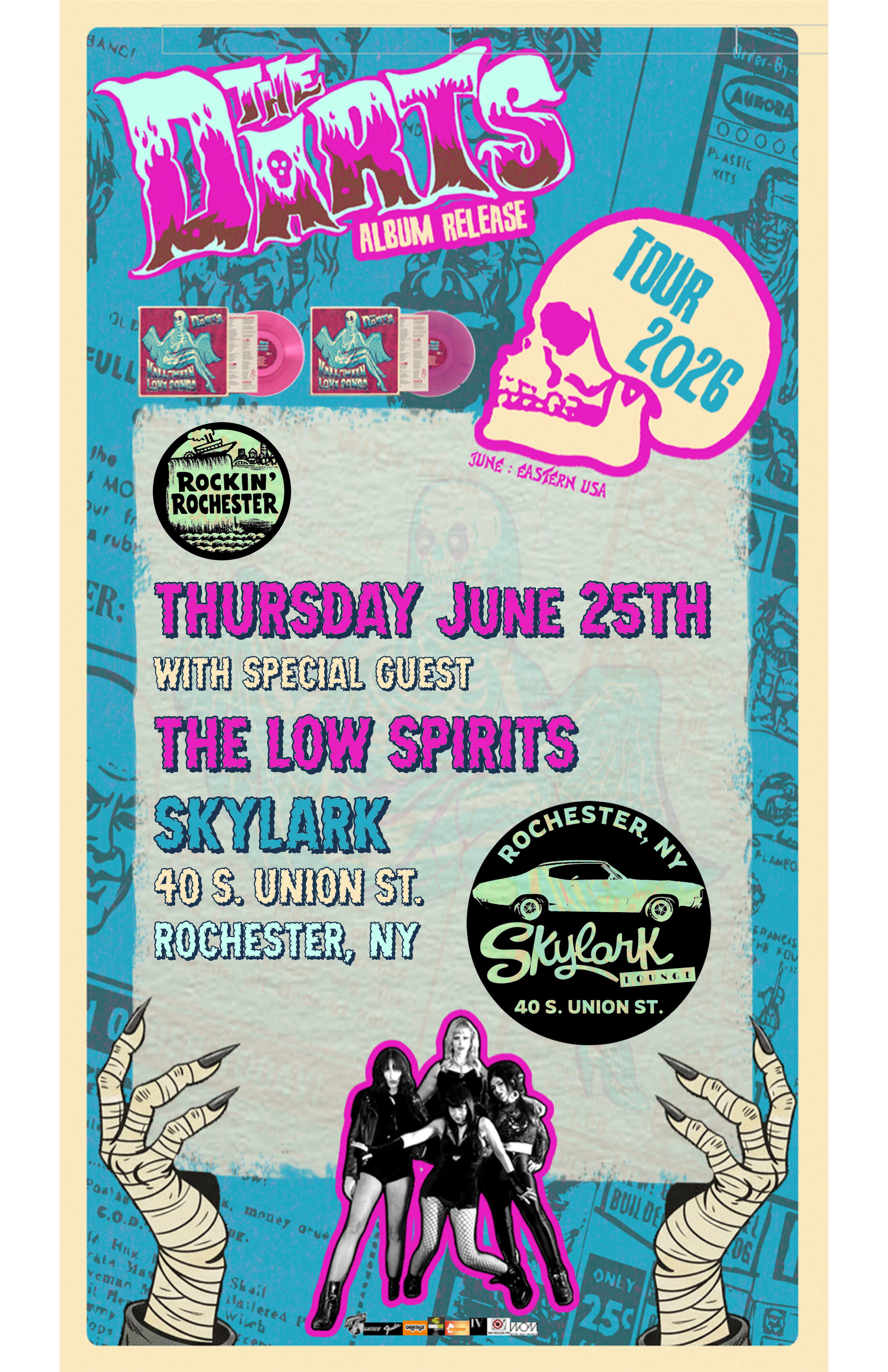 THE DARTS exploded onto the scene in 2016 with a fiercely classic sound that invests deeply in late 60’s garage, with shadows of horror pop and tinges of psychedelic rock - the perfect act for the Bride of Frankenstein's bachelorette party. The band formed in 2016 and wrote and released two EPs within months. In 2017, the band signed with Dirty Water Records (UK) and released its 1st full-length album, ME.OW. In 2018, Jello Biafra's legendary punk label Alternative Tentacles Records released their first 7” record and and in 2018, The Darts did a US tour with The Damned. Biafra then released their 3rd album in 2019 and the band crisscrossed the US and Europe many times thereafter including performances at major festivals like Sjock Fest and Punk Rock Bowling, performing with The Black Lips, Joan Jett, The Dwarves, Dead Kennedys, Devo, and Turbonegro. They have backed both Biafra and Dwarves' frontman Blag Dahlia live on stages and were featured on tv’s Peaky Blinders. Crowdfunded album SNAKE OIL came out March 2023, co-produced by Jello Biafra himself, followed by nearly 100 dates in Europe, UK, and US and an appearance on famed KEXP. BOOMERANG was released in 2004 followed by huge festivals and a solid year of worldwide tours. The compilation album NIGHTMARE QUEENS came out in 2025 along with a new lineup: Nicole Laurenne, Rebecca Davidson, Lindsay Scarey, and Rikki Styxz, who have toured nonstop internationally the entire year. HALLOWEEN LOVE SONGS is here for 2026!